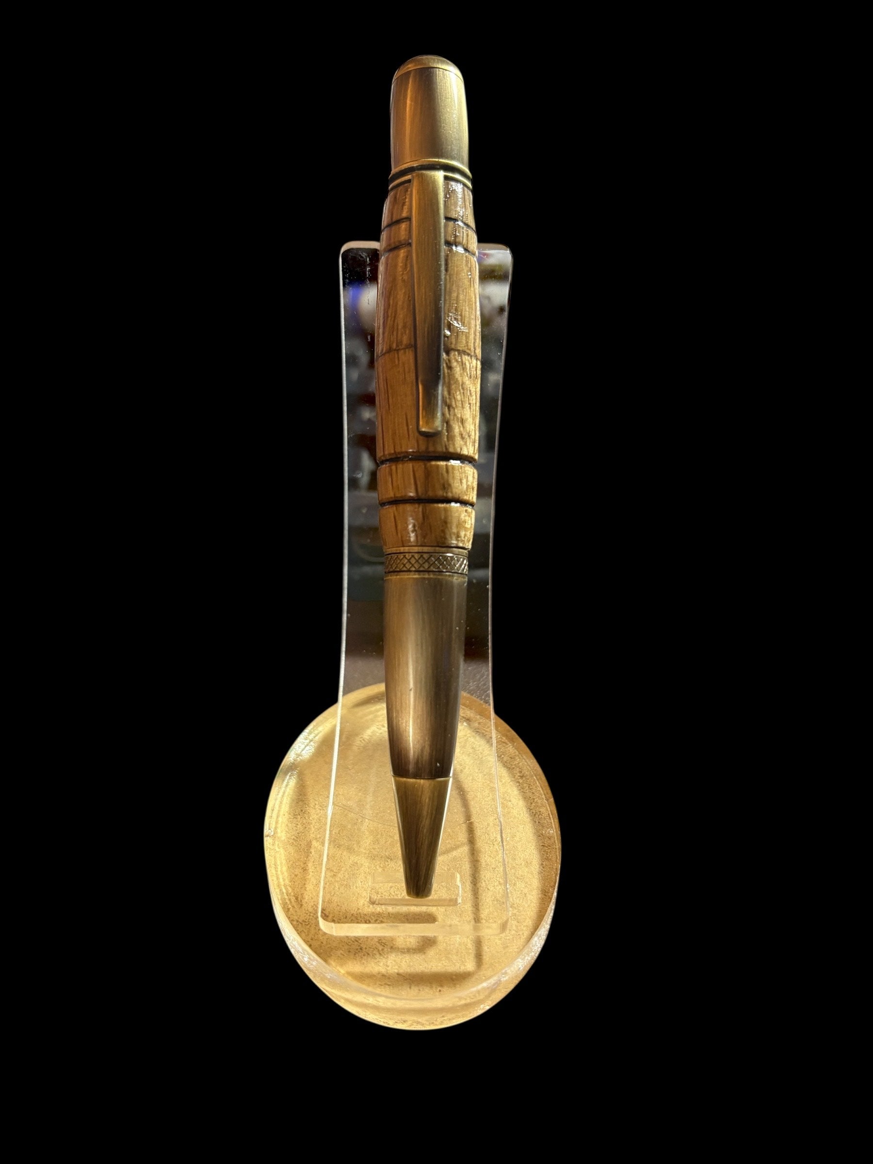The barrel is turned from Japanese Mizunara oak — famed for aging fine whisky — paired with a rich Antique Brass finish. The contrast is striking: the brass gleams with timeless strength, while the Mizunara offers a warm, tactile feel that almost seems to float in the hand, like holding an ergonomically refined whisky barrel.